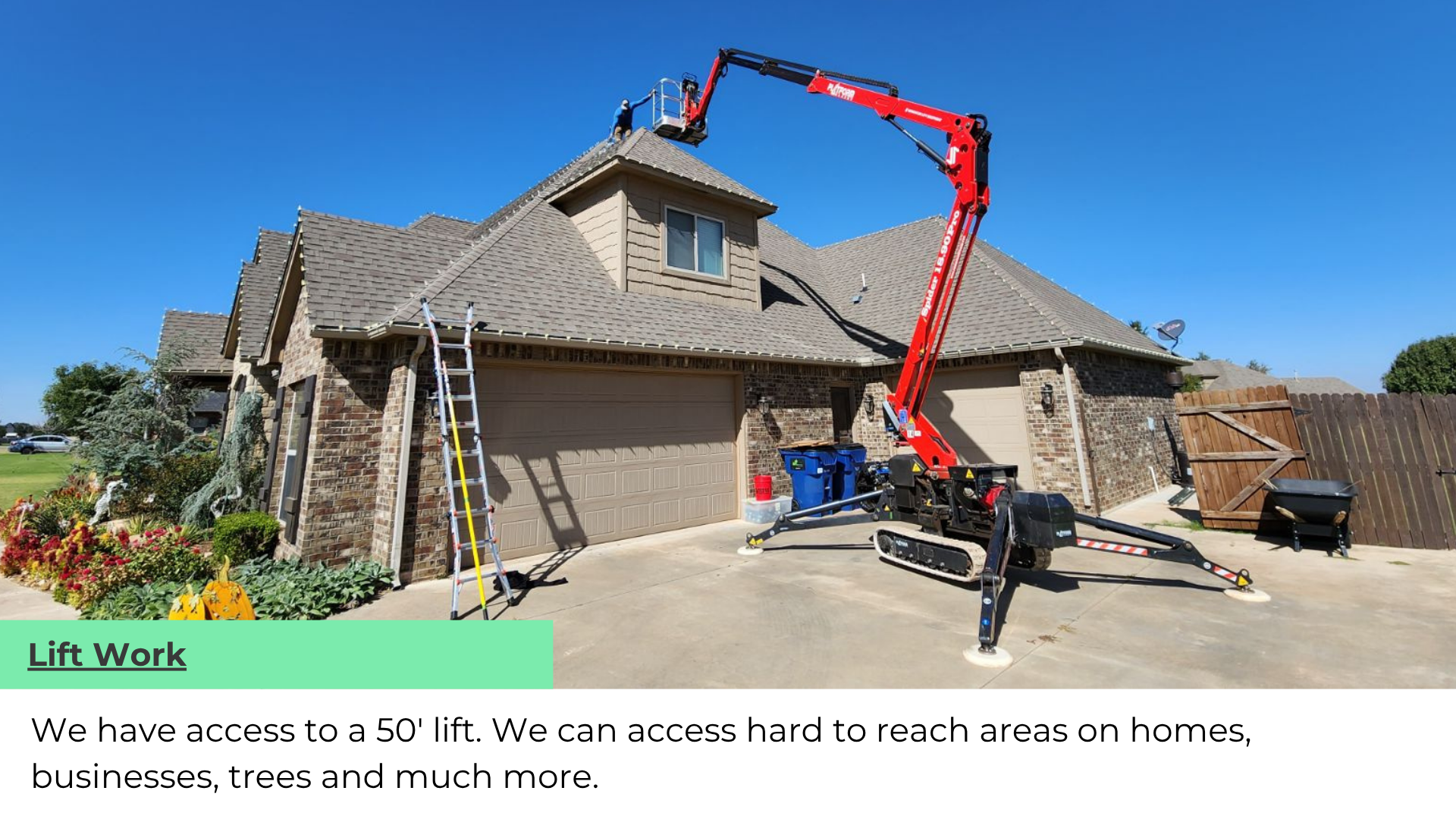 Our business owns and 60’ Platform Spider Lift - a very versatile machine. What this means for you? A relatively small footprint with a base at 36” wide and max lift at 60’, we have access through most gates and hard to reach areas. Not mention, best part is, it’s on a track system which means it leaves no damage to your lawn or property.