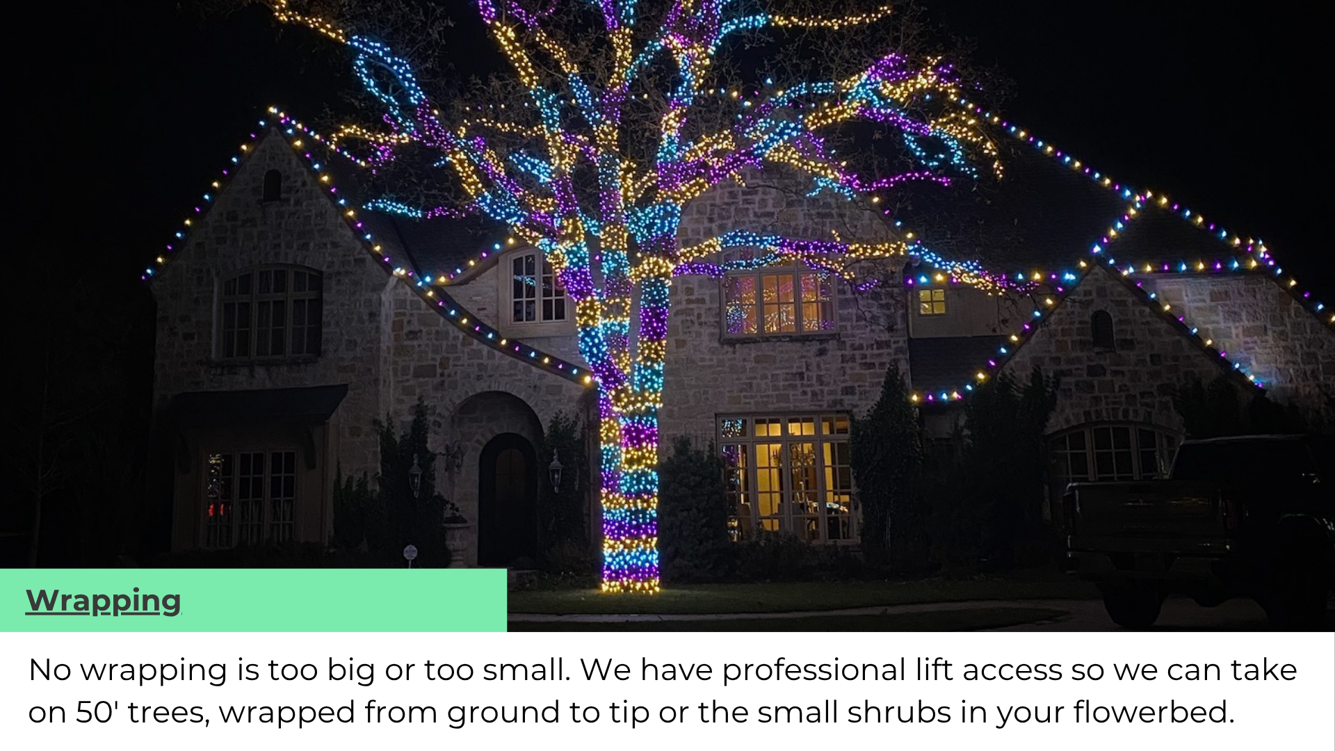 Embrace the joy of the holiday season without the hassle of installing Christmas lights. If you’re seeking a seasonal lighting solution, our professional Christmas light installation service is perfect for you! We only use the highest grade lighting on the market, featuring a wide array of colors and color combinations to fit your vision. Our Christmas lighting we provide allows us to give you a true, custom fit.